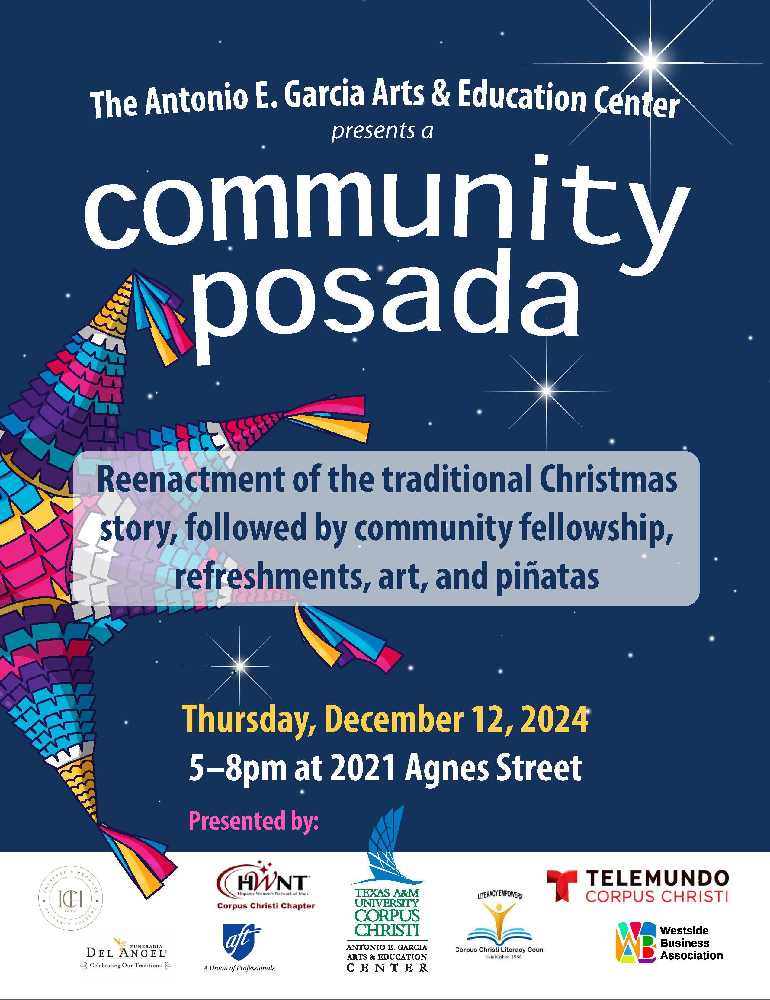 Reenactment of the traditional Christmas story, followed by community fellowship, refreshments, art, and piñatas. Free! Sponsored by the American Federation of Teachers, Corpus Christi Literacy Council, Hispanic Women's Network of Texas Corpus Christi Chapter, Funeraria del Angel, Instituto de Cultura Hispanica de Corpus Christi, Telemundo Corpus Christi, & Westside Business Association.