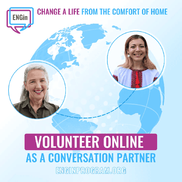 Join ENGin as a conversation partner and be matched with a learner in Ukraine for weekly one-on-one English conversations. In just one hour a week, you can help someone build confidence, break the language barrier, and feel supported, all while discovering a new culture and making a genuine human connection.
